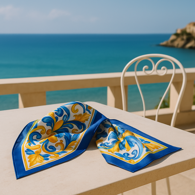Racconta la Sicilia in ogni dettaglio: il nostro foulard in tessuto leggero, decorato con motivi ispirati alle maioliche tradizionali, è l’accessorio perfetto per aggiungere un tocco di eleganza mediterranea a ogni look.