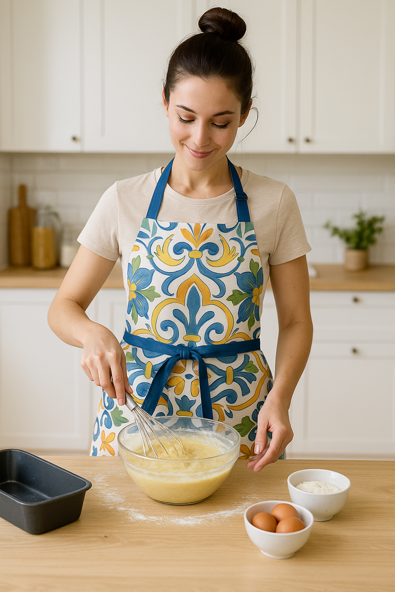 Ogni grembiule è un piccolo capolavoro artigianale: il motivo delle maioliche può variare, rendendo ogni pezzo unico e irripetibile.